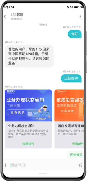 创新提出应用号服务,短信界面内可以服务交互,无需跳转